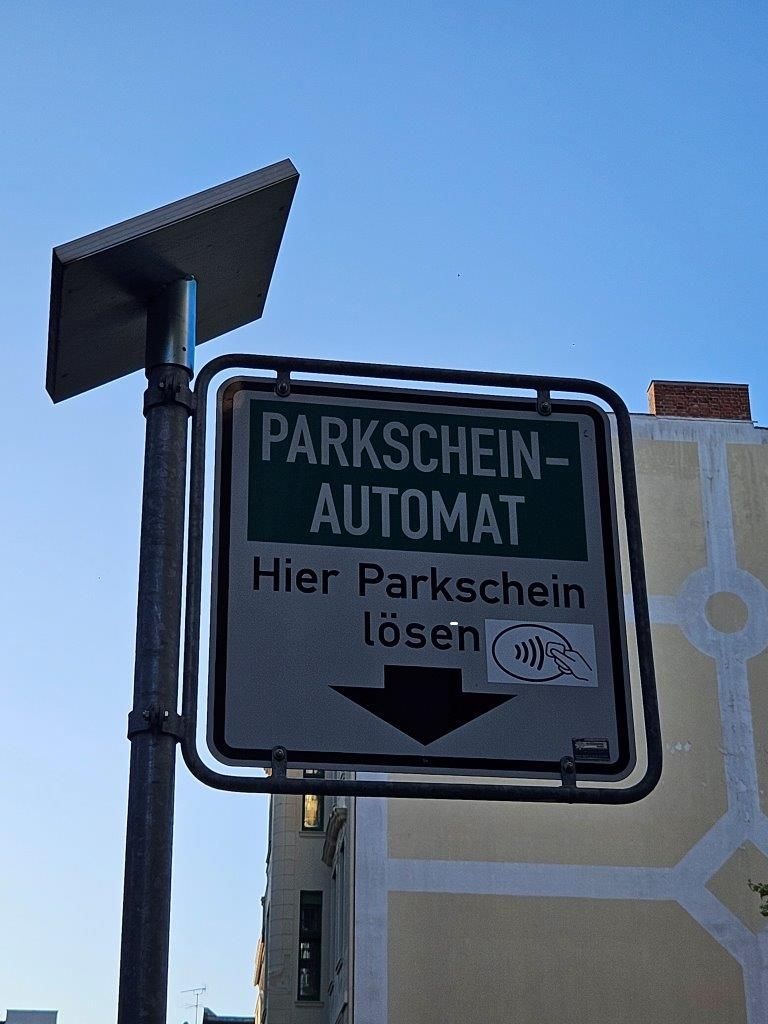 Diese Parkscheinautomaten sind am Symbol für Kontaktloszahlung auf den Hinweisschildern erkennbar.