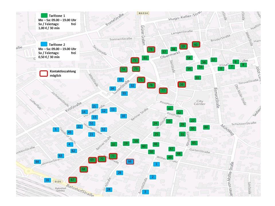 Görlitz ist unterteilt in 2 Tarifzonen. Die Höhe der Gebühr ergibt sich aus der jeweiligen Tarifzone (siehe Tabelle). Grundsätzlich bietet aber jeder Parkscheinautomat eine "Brötchen-Hol-Funktion", d.h. dass das Lösen eines Parkscheins für 15 Minuten kostenfrei ist.