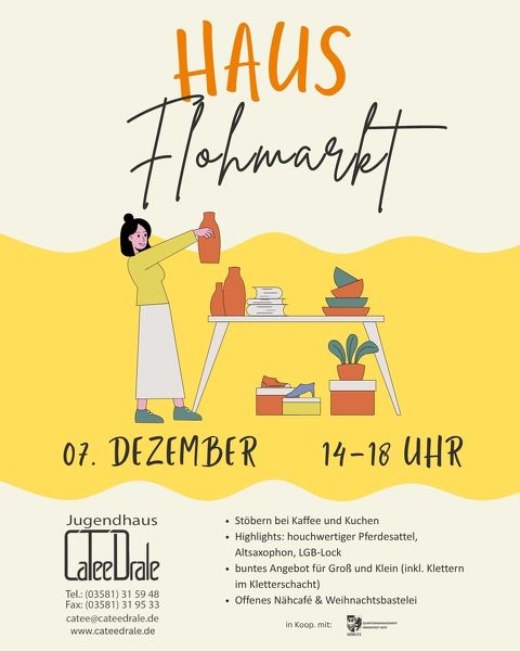 Am Samstag, 07. Dezember, verwandelt sich das Jugendhaus CaTeeDrale von 14 – 18 Uhr in einen bunten Marktplatz. Stöbert euch durch Second-Hand-Schätze, trefft Nachbarinnen/Nachbarn und macht’s euch bei Kaffee & Kuchen gemütlich.
