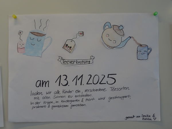 Das von Hortkindern gestaltete Plakat lud zur Teeverkostung ein. Foto: Zwergenhaus