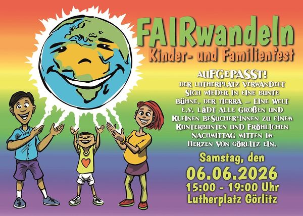 Am Samstag, den 06. Juni 2026, wird der Lutherplatz in Görlitz wieder zu einem bunten Treffpunkt für Groß und Klein. Von 15:00 bis 19:00 Uhr lädt der Tierra – Eine Welt e.V. zu einem fröhlichen Familienfest mit vielfältigen Angeboten ein.
