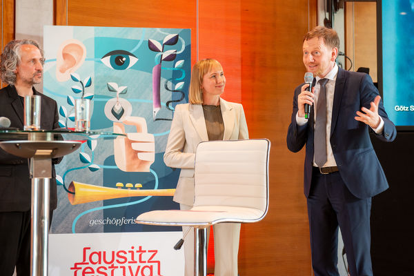 Berlin, 23.03.2026: Intendanz und Geschäftsführung des Lausitz Festivals stellten heute in der Landesvertretung Brandenburg beim Bund in Berlin Highlights des diesjährigen Festivals vor, das vom 25. August bis 13. September 2026 in vielen Spielstätten in der Lausitz zu erleben ist. Vom Podium aus sprachen Michael Kretschmer, Ministerpräsident des Freistaats Sachsen und einer der beiden Schirmherrn des Festivals, sowie Staatssekretär David Kolesnyk, Bevollmächtigter des Landes Brandenburg beim Bund, zu den Gästen der Veranstaltung.
