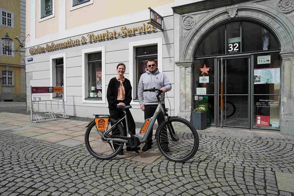Eva Wittig, Geschäftsführerin der Europastadt GörlitzZgorzelec GmbH, und Daniel Reichstein, Geschäftsführer Radwerk Görlitz, vor der Görlitz-Information mit einem der neuen E-Bikes, die demnächst über die Tourist-Information ausgeliehen werden können., © Franziska Glaubitz