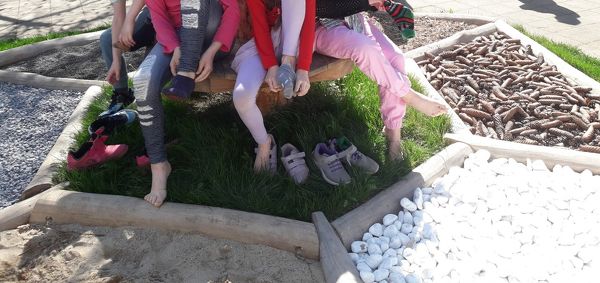 Mit großer Freude haben die Kinder die verschiedenen Felder ausprobiert. Der Barfußpfad soll die sensomotorische Wahrnehmung fördern, das Wohlbefinden unterstützen, die Koordination und Aufmerksamkeit fördern und die Fußmuskulatur trainieren.